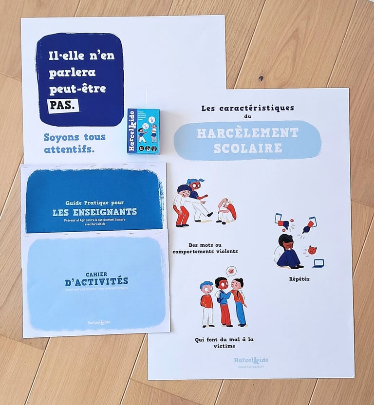 🔸 1 jeu de cartes HarcelKido pour explorer le harcèlement scolaire à travers des mises en situation concrètes et des discussions guidées, favorisant la réflexion et l’expression des élèves.